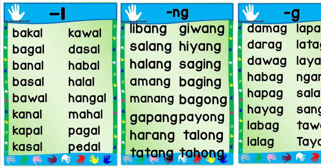Filipino word family charts are reading materials that group words according to a shared ending sound or spelling pattern. Instead of showing random vocabulary words, these charts organize words in a way that helps children notice common structures. For example, children may read sets of words ending in -l, -ng, or -g.